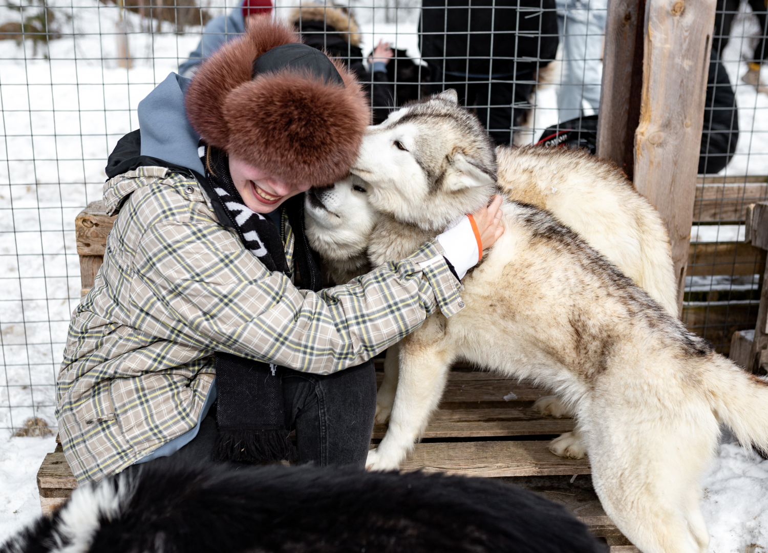 В дальнем загоне ждут собаки — при виде людей восемь разноцветных хаски не могут сдержать радость и начинают кричать в полный голос. Если просунуть за решетку пальцы, они моментально окажутся облизаны. Да и в целом будьте готовы — собачья нежность выражается в жарких слюнявых поцелуях. Но кто сможет устоять перед этими пушистыми мордами?
