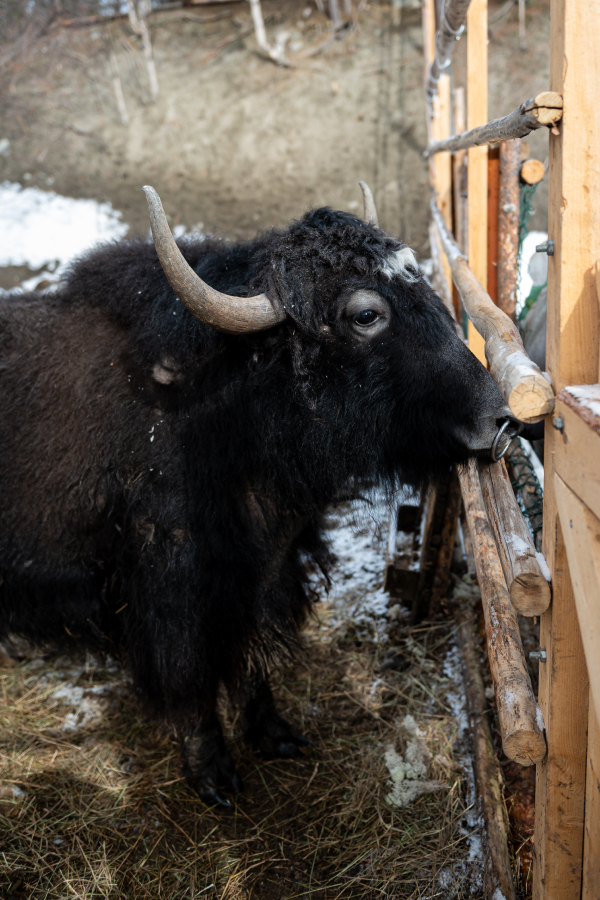 На улице можно покормить ягелем яка Добрыню. Як совсем молодой — ему полтора года, у него в носу огромное металлическое кольцо и пушистые чёрные ресницы на нежных веках. Он жует ягель белыми, почти человеческими зубами, мотает рогатой головой и размахивает огромным лошадиным хвостом.